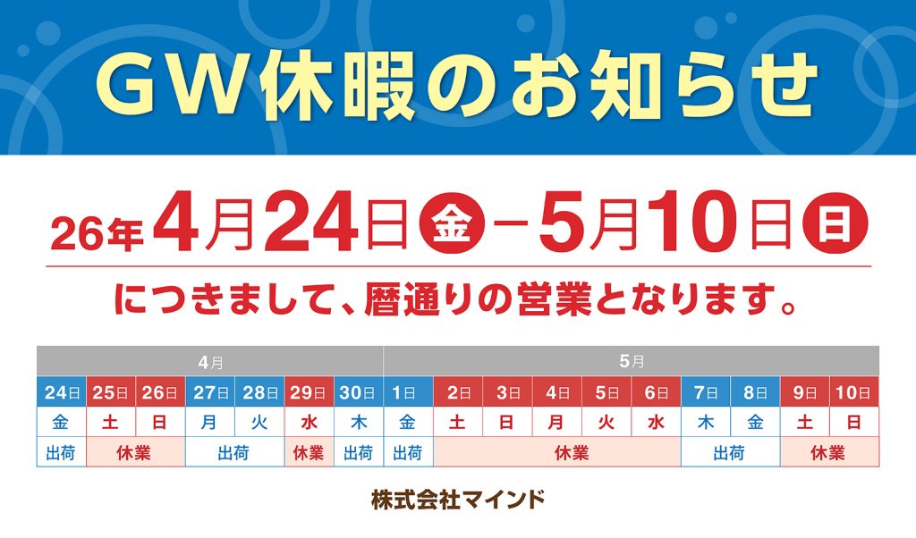 弊社では、誠に勝手ながら下記日程をゴールデンウィー休業日とさせていただきます。